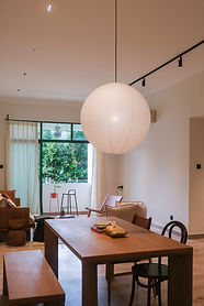 the round paper pendant becomes the quiet heart of the room illuminating the space with its glow, making the harsh lines of the carpentry soften with every glance.